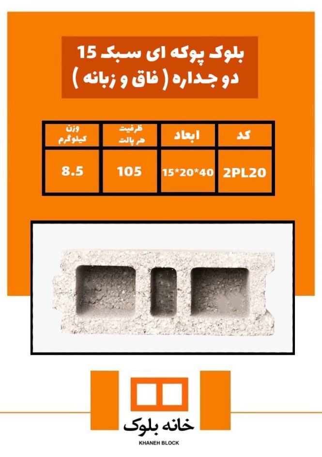 - دو جداره: این بلوکها دارای دو جداره با یک حفره در میان هستند و برای دیوارهای غیر باربر و تیغههای داخلی مناسباند.